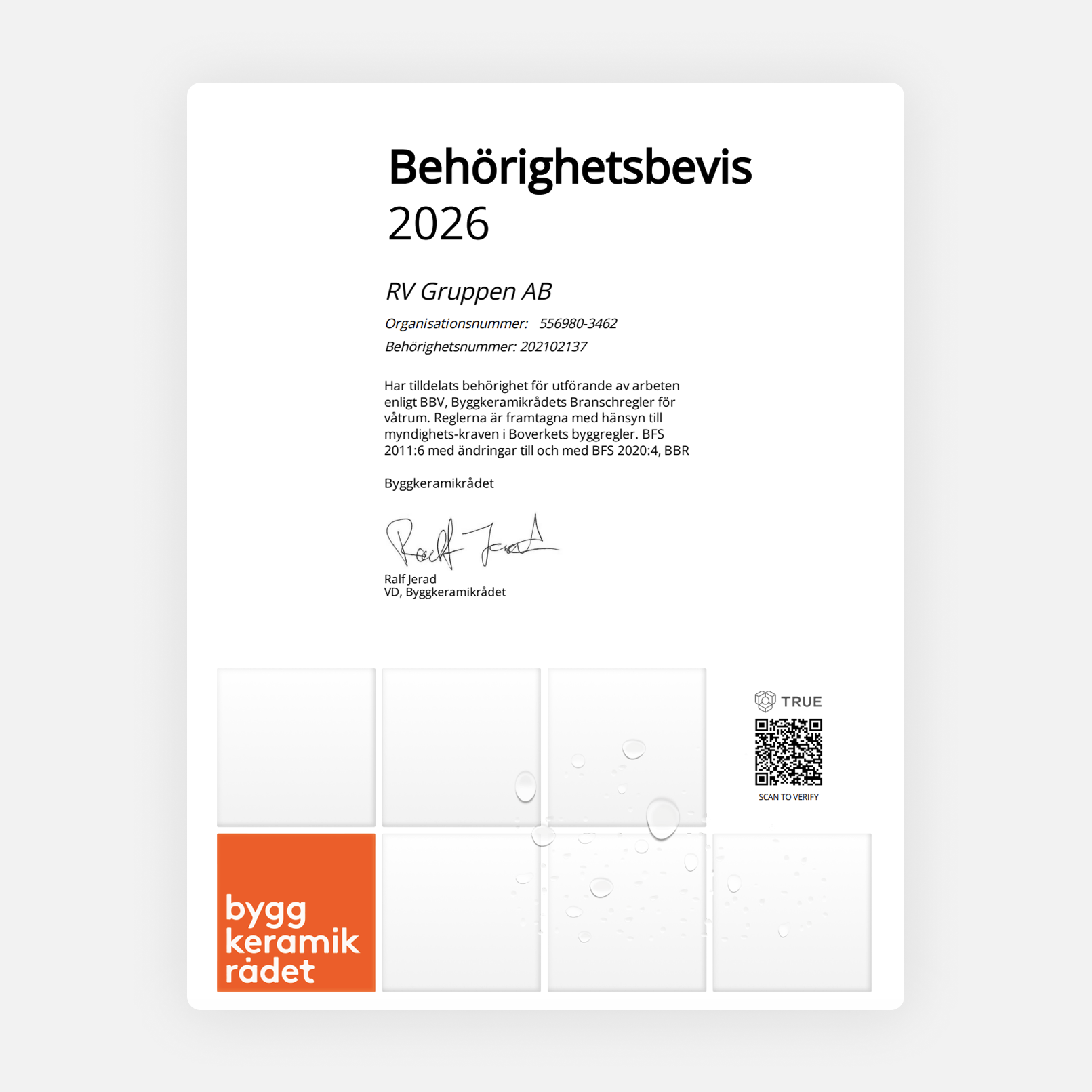 Detta är krav idag från försäkringsbolagen och RV Gruppen levererar kvalitetsdokument på alla våra badrumsrenoveringar.