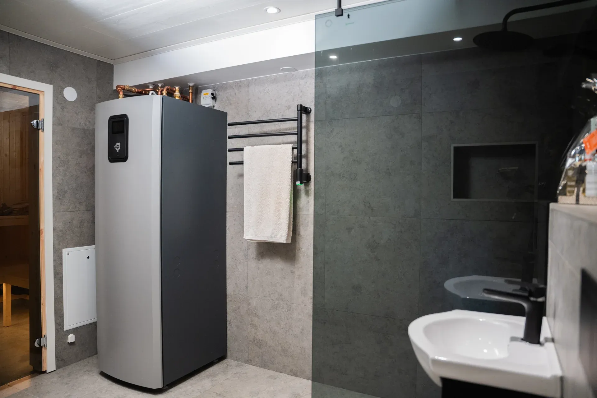 I ett hem i Upplands-Bro fick RV Gruppen i uppdrag att skapa ett modernt badrum med bastu på en begränsad yta.